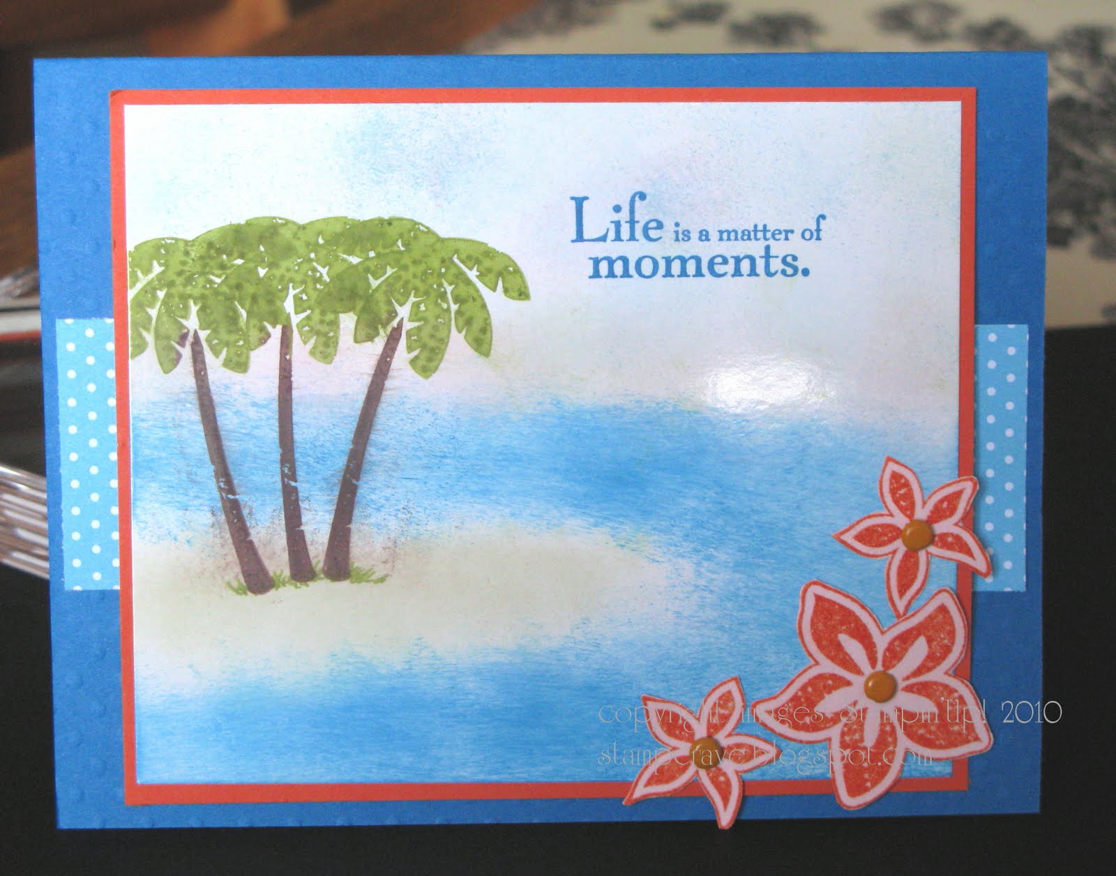 ~Paper: Shimmery White CS, Melon Mambo CS. ~Inks: Old Olive, Regal Rose, Melon Mambo.~Accessories: Color Spritzer, Melon and Old Olive Markers, Earth Elements Brads, 1/16" circle punch.